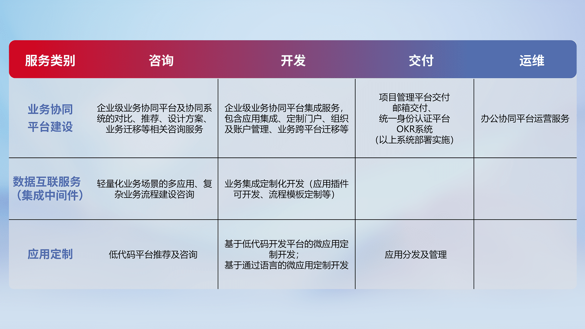 针对钉钉、、、企微、、、、IDaas等平台级产品提供产品的规划、、、方案、、交付、、、定制化开发等服务,,,实现如统一协同办公、、、、智能客户服务、、、、混合会议管理、、、、智能数据查询、、等业务场景,,实现数字化转型。。